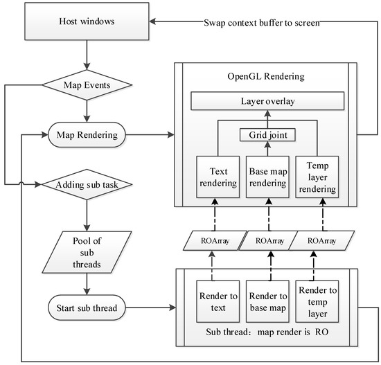 The tasks in the child threads pool will be processed in turn. These tasks include reading geospatial data from the geospatial data sets, determining whether the data is in the visible range, cropping, and organizing the data to form a rendering RO. After the sub-thread processing is completed, the redraw operation is called back. The redraw operation is to render the processed RO through the GL function to form a pixel matrix and to render it onto the screen.