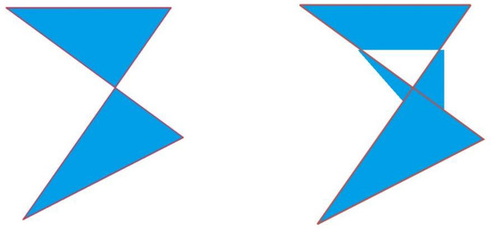 If the polygon features are drawn by the triangulation method of points and line elements, there is a defect operation. If the polygon feature is drawn by triangulation, the process is the geometric polygon that expresses the polygon feature is divided into a combination of multiple triangles, and the triangle mesh completely covers the polygon and has no intersecting edges, and then renders in the video memory. The problem is that the time complexity of the triangulation algorithm is O(n2). When the polygon boundary is complicated, especially for the polygon containing the island and the hole, the time-consuming exponential growth. Moreover, the triangulation algorithm does not support the profiled surface, especially for the self-intersection polygons (Figure 6). The Delaunay triangulation is essential for complex polygons, like self-intersection polygons. In our study, multi simple polygons are generated from a self-intersection complex polygon and then Delaunay triangulation is running.