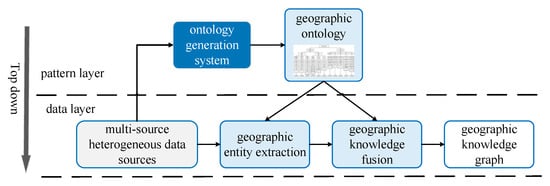 A GeoKG is constructed using a “top-down” approach, which is mainly divided into a schema layer and data layer, as shown in Figure 3. The schema layer is mainly a geographic ontology or concept layer, while the data layer is mainly geographic entities and related attributes. The basic idea is to realize the construction of geographic ontologies and concept layers, according to geographic ontologies, based on geographic information data (such as place name data, topographic maps, and so on), to achieve the extraction of geographical entities, related attributes, combined with the filling of relationships by thematic websites and encyclopedia data entities.