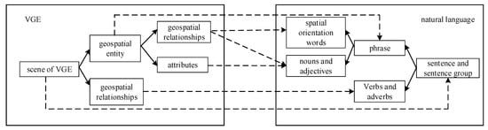 In extracting geographic knowledge from a VGE scene and realizing the transformation of “view (graphic) → semantic”, the core idea is to establish an interpretative model mapping from scene to semantics, as shown in Figure 4. The multi-level semantic parsing model is used to resolve the topological, directional, and distance relations in semantic descriptions at different scales of the virtual scene.