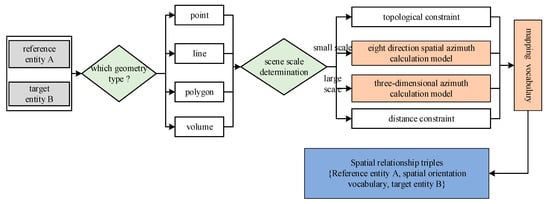 The model mainly considers the types of geographic entities and establishes a mapping of spatial topological relations expressions and spatial description vocabularies (as shown in Table 1). As shown in Figure 5, based on vector data (usually for small or medium-scale scenes) and 3D models (usually for large-scale scenes), geo-entities are extracted and, through a geometric calculation function, a spatial topology between the geo-entities is calculated. Then, topological relations and spatial type mapping vocabulary (as shown in Table 2) are used to convert the spatial topology to semantic relations.