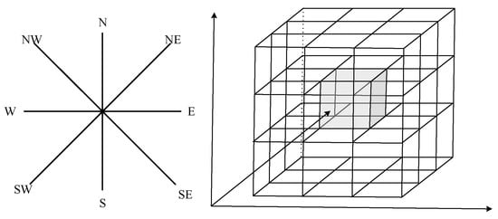 The semantic analysis of orientation relationships needs to consider the constraints of topological and distance relations. As shown in Figure 6, we first need to describe the types of geometric features (such as point, line, surface, and volume) and separately calculate the spatial orientation, eight-direction spatial azimuth model for small-scale scenes, and three-dimensional azimuth model for large-scale scenes. The former divides a two-dimensional plane into eight parts, as shown in Figure 7 (left); the latter divides three-dimensional space into 27 parts, as shown in Figure 7 (right). Then, according to the mapping vocabulary, the semantic relations between entity A and entity B are confirmed.