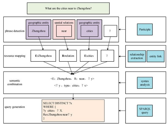 Due to the complexity of multilingual relations in natural language question-answering (such as “what are the cities near the east of Zhengzhou?”), we only consider unilateral questions (e.g., “What are the cities near Zhengzhou?”). As shown in Figure 9, the key technologies include: geographic entity identification, resource mapping, and querying statement generation.
