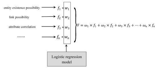 Geographic entity linking is used to calculate the semantic similarities between candidate geographic entities and geographic referential entities. We apply multiple characteristics to implement the logistic regression model. In order to enable multiple feature values, to better represent the semantic similarity of entities, after completing entity identification and matching the set of candidate entities, it is necessary to calculate the feature values for all entity pairs to evaluate the linking possibility between them, as is shown in Figure 11.