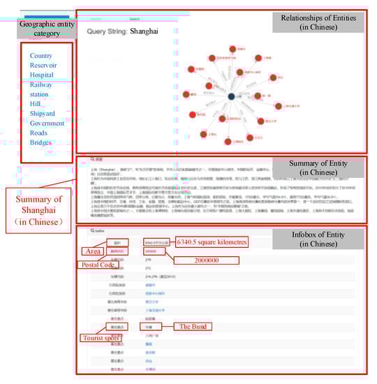 The experimental platform was a Windows 10 system, the database was MongoDB, and the development environment used was Eclipse. The results of knowledge card are shown in Figure 12. The knowledge card includes: relationships of Entities (shown as a “node-edge” graph), summary of entity, infobox of entity, and geographic entity category.