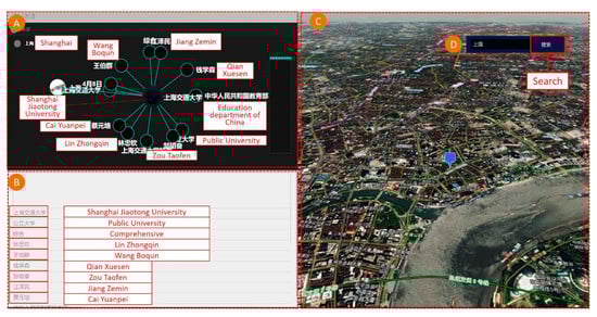 Q&A based interaction with VGE ((A): Chinese geographic knowledge graph; (B): geographic entity information; (C): 3D VGE scene; and (D): Q&A search bar.).