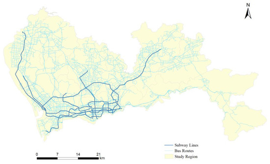 We use a week of SCD starting from 3 to 9 April 2017. The SCD used in this study holds the names of boarding and alighting stations for each subway passenger. Bus passengers are not required to tap their smart cards when alighting. Therefore the information on alighting bus stops is not recorded. In addition to the SCD, we have access to bus trajectory data, public transit network, and road network data. These three datasets are registered into the same georeference framework, i.e., World Geodetic System 1984 (WGS 84) coordinate system and Universal Transverse Mercator coordinate system (UTM) Zone 50. The public transit network dataset contains the location, identification, and schedule information of all subway lines and bus routes. Based on GPS devices installed on each bus, we can obtain bus trajectory data such as longitude and latitude, speed, and travel direction at approximate 20–60 second intervals. In addition, bus identification information including license plate numbers, number of transit lines, and company names are all saved. With more than 6 million records collected for each day, the size of the SCD set for the week amounts to 6.5 GB. Each day, the bus trajectory dataset has approximately 63–73 million GPS records.