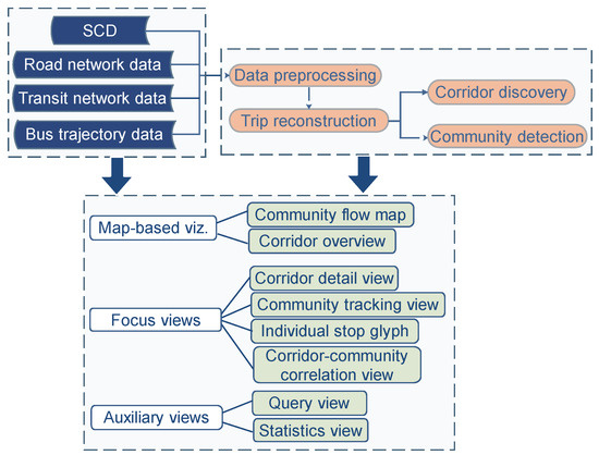 The proposed approach delivers a comprehensive solution to pre-process, analyze, and visualize complex public transit travel patterns (Figure 2). This approach first fuses SCD with other urban data to reconstruct transit trips. It then segments the study region into hierarchical areal units (i.e., public transit mobility community) according to mobility features of trips and static local features using graph embedding. Based on recovered public transit trip data, we develop a clustering-based algorithm for extracting transit corridors to represent mobility interactions between different regions. Based on detected corridors and mobility communities, we develop various visualization forms to represent these transit movement patterns on maps and other views. An interactive web-based mapping prototype is also developed to enable the visual exploration of mobility structures over space and time. Specific visualization forms are designed and implemented in the web-based prototype to facilitate the analysis of massive transit data, including map-based visualization, focus views, and auxiliary views, which will be detailed in Section 3.5. The discovered mobility community structure and transit corridors can be visualized on interactive maps. The focus views consist of four types of visualization: (1) a corridor detail view that shows detailed trip information based on a simplified schematic map for each selected corridor; (2) a community tracking view that presents evolving changes of specific communities across time; (3) a stop glyph plotting the statistical information of all trips that originate, end, or pass a specific bus stop or subway station; and (4) a corridor–community correlation view illustrating the spatio-temporal correlations between transit corridors and mobility communities using parallel coordinate plots.