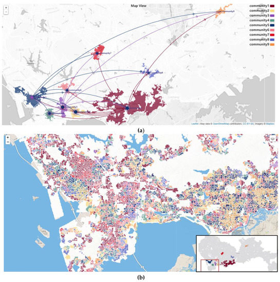 Transit-based mobility community structure on a holiday. (a) High-level community flow map; (b) low-level community clusters.