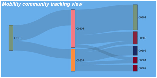 Mobility community tracking view. We can observe that the selected community “C0101” (indicating a detected community on April 1) has a significant number of transit trips connecting it and two communities on April 2 (“C0206” and “C0203”). These two are further connected with five communities (C0301, C0302, C0304, C0305, and C0308) on April 3. We can see that “C0101” is strongly connected with “C0206” and “C0301”, as indicated by the width of ribbons between these communities.