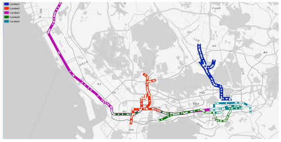 The concept of “transit corridors” has been widely adopted and put into real-world planning and management practices [37]. We define a corridor as a directional linear road segment consisting of multiple transit stops with significant numbers of passengers. Note that corridors may contain multiple branches and may overlap with other corridors. Based on massive transit trip data, time-varying transit corridors can be extracted to represent the most significant travel demand patterns across space and time. The corridor-extracting algorithm is developed on the basis of public transit trips, each of which is characterized by one single travel purpose. Each trip may consist of multiple legs, and each leg corresponds to one smart card transaction. We proposed a share-flow clustering algorithm [34]. The algorithm was based on the concept of “accumulated transit flow”, which calculates the number of stops each passenger passes after boarding. If two stops have a large shared “accumulated transit flow”, then the downstream stop is “directly transit-flow accessible” from its preceding adjacent stop. Starting from stops with a large amount of “accumulated transit flow”, the algorithm iteratively evaluates adjacent stops along the travel direction. If this next stop is directly transit-flow accessible from the current stop, the road segment between the current and the next stop will be linked to the current corridor. After the initial growth of corridors, a pruning and merging process is performed to remove short and non-significant corridor candidates. By this clustering algorithm, linear corridors can be discovered dynamically for any specific time interval. The algorithm can be described in the following steps: