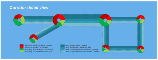 Users can select and observe details of a corridor (Figure 7). The layout of a corridor is simplified in a schematic form to retain only topological connections (similar to metro maps). The above-mentioned four types of trips are visualized for the selected corridor: each ribbon that connects two adjacent stops is divided into four components, and the width represents flow counts. Key stops within a corridor are depicted as rings, with red/green representing boarding/alighting counts. Passengers boarding at a stop are further categorized into two groups: those who will be alighting within the same corridor and those who will be alighting outside the corridor. The two groups are denoted by dark and light red, respectively. Similarly, passengers who alight at a stop are divided into two groups: “boarding from at least 5 stops away” and “boarding close to the current stop”. Dark- and light-green colors are used to denote the two groups. When selecting a particular corridor and observing its details in the corridor detail view, users can conduct local pattern exploration task 1 to fetch boarding, alighting, origin, and destination information in a compact visualization form.