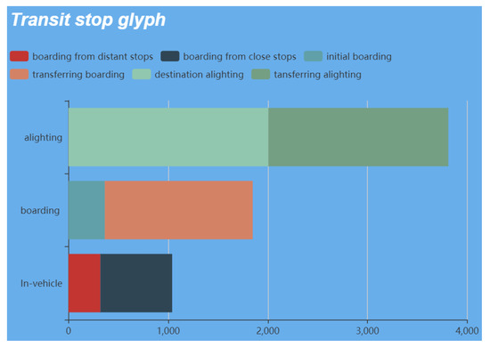 The trip information of individual transit stops is plotted in a glyph when users click on a stop on the map. Figure 8 shows that the stop glyph can visualize in-vehicle, boarding, and alighting passenger numbers. In-vehicle passengers can be further divided into boarding from distant and nearby stops. Boarding passengers consist of initial boarding and transferring passengers. Alighting passengers comprise those who finish their trips and those who transfer at this stop. One can easily tell the role played by this stop for the whole transit network: it could be an important origin stop, destination stop, or a transfer stop.
