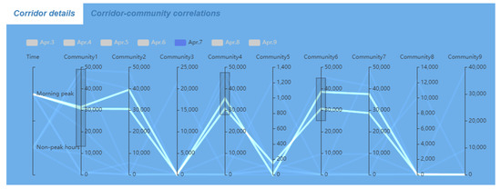 In the previous sections, we introduced our approaches to discover primary transit corridors with significant travel demands and mobility communities with similar travel patterns. Furthermore, geovisual analytics can be performed to examine correlations between these two identified time-varying mobility representations. An integrated parallel coordinate plot is designed to describe their correlations. For any pre-specified time interval, we can draw identified corridors as polylines and represent discovered communities as vertical parallel axes. For each corridor (i.e., polyline), the intersection point on an axis (i.e., a community) indicates the number of transit passengers who originate from the community towards the corridor. In this way, spatio-temporal correlations between each corridor and each community can be illustrated in a compact manner. We can easily find which community contributes the biggest portion of transit flow to a particular corridor or identify which corridor is the most correlated one for a specific community. We can also get to know the composition of any corridor or community. For example, the parallel coordinate plot can reveal whether most trips from a community are correlated to a few corridors or are evenly distributed over a number of corridors across the city. Note that these correlations are not equivalent to intersection relations between corridors and communities, which are explicit on maps. As long as the origins of constituent trips for a corridor can be traced to a community, the corridor and the community establishes a correlation. The number of these correlations represents the intensity of interactions between a corridor–community pair. For each vertical axis, a filtering box can be specified to find corridors that meet the transit flow number search range criterion. Multiple filtering boxes on different axes can be interactively designated to further identify corridors that are correlated to selected communities based on specified transit flow ranges (Figure 9). This geovisual analytics tool enables users to undertake the comprehensive analysis task to mine correlation knowledge between corridors and mobility communities.