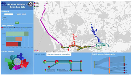 The visual designs were implemented in a web-based prototype, which was developed with PyCharm Pro 2018.3.1 on a Windows 10 operating system. Major visualization modules were developed in JavaScript following the standards of HTML5 and CSS3. The user interfaces comprises four major components (Figure 10): (1) query view in the upper-left portion; (2) map view in the upper right; (3) statistics view in the bottom-left corner; and (4) focus views for corridors and communities in the bottom-right region. In the query view, users can specify the time range and select SCD falling within this range for analysis. The map view depicts discovered corridors and mobility community structures. Different corridors are differentiated by distinct colors. The map view embeds a Baidu Map as the background map. Flow maps can be produced to describe primary transit flows between major communities. Focus views illustrate three types of detailed displays: corridor detail view, community tracking view, and corridor–community correlation view. All of these views are dynamically linked. User interactions within any view will apply to other linked views for the same data (community, transit stop, or corridor).