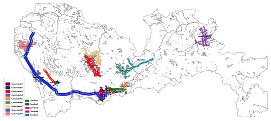 Figure 11 shows that it can beneficial to examine intrinsic travel patterns by integrating transit corridors with mobility communities. It can be observed that the most salient corridor connects community Nos. 8 and 9 and community No. 1, which have the most job opportunities in the city. Based on the flow direction of the corridor (shown by animated particles), we can find that a large number of commuters travel towards community No. 1 for work in the morning. Another corridor in the Northeast indicates that many passengers who live in remote outskirts make trips towards community No. 6, which features many industrial parks and high-technology companies. With these interactive maps, both corridor and community information can be combined to further investigate the travel origins and destinations for different times and dates, thereby deepening our understanding of evolving movement patterns across the city. These integrated maps can also contribute to the explanation of the interactions between transit corridors and mobility communities.