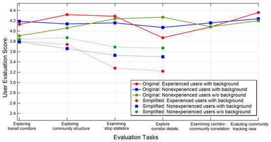 Twenty-three users were interviewed to obtain comments and feedback on our geovisual analytics approach based on their experience using the prototype. Sixteen of them are experts in public transportation, and among them, nine have geovisual analytics development knowledge (experienced users). The users can be classified into three groups: (1) experienced users with background knowledge (9 users); (2) non-experienced users with background knowledge (7 users); and (3) non-experienced users without background knowledge (7 users). Before allowing them to use the prototype, we introduced the proposed geovisual analytics approach and the web-based prototype. We asked users to evaluate 6 geovisual analytics tasks: (1) to discover and visualize transit corridors; (2) to extract and visualize mobility community structure; (3) to obtain transit stop summary statistics information; (4) to evaluate the corridor detailed view; (5) to evaluate the mobility community tracking view; (6) to evaluate the corridor–community correlation view. Numeric scores were obtained from questionnaires, with “0” indicating the worst user experience and “5” indicating the best. Figure 12 summarizes the scores of interviewed users.
