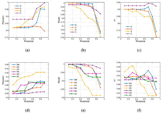 (2) Recall was defined as the proportion of positive matches that were correctly identified: . Recall represents the ability to find the corresponding POIs in the dataset, and the higher the recall value, the stronger the ability of the model to find the corresponding POIs. Figure 8b,e,h,k showed that the recall performance of the three-attribute models was better than those of the two-attribute models and the single-attribute models. In the three-attribute models, the SNA model achieved the strongest performance in terms of recall (compared with the SNC, SAC, and NAC models).