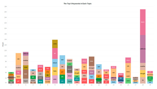 Most of the tweets are classified to topic 1, 18, 10 and 7. Figure 1 shows the top keywords in each topic where the length indicates the weight of each word in its corresponding topic. The words with high weights contribute more in distinguishing the topic, namely can be considered as the signal words of that topic. The word such as CA, Storm, and Rain are frequently seen in many topics. In addition, flood, NASA, and climate change are also important keywords in a few topics. Figure 2 shows the temporal variation of number of tweets in each topic. Tweets in topic 1 and 18 increased dramatically when the storm hit CA in early January 2016, indicate strongest temporal correlation to the CA storm, followed by the topic 7 and 10. Although such semantic–temporal analysis does distinguish the tweets by contents and temporal variation, limited knowledge is gained about how people discuss El Niño on Twitter, especially since several topics have similar keywords.