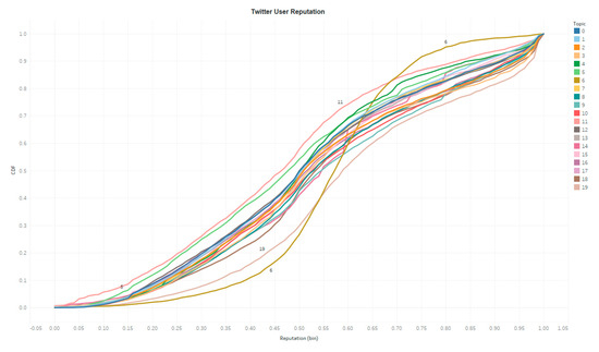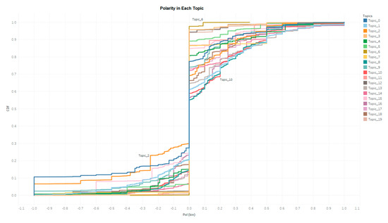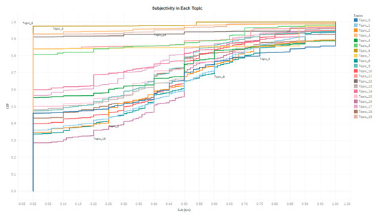 A sentimental analysis is performed for all tweets with the TextBolb Python Library (https://textblob.readthedocs.io/en/dev/). Special characters, e.g., URLs, are excluded from each tweet before this analysis. The outputs include a polarity index and a subjectivity index. The polarity index ranges from negative 1 to positive 1 indicating a very negative tone to a very positive tone, and the subjective index ranges from 0 to 1 indicating a very objective tone to a very subjective tone. Figure 3 and Figure 4 display the Cumulative Distribution Function (CDF) of polarity and subjectivity of all the tweets in each topic. Tweets in different topics present various sentiments. For example, topic 2 tends to be more objective and negative, as the polarity of tweets in topic 2 tends to be more negative and the subjective of the tweets in topic 2 is lower, namely more objective, than other topics. Again, single dimension analysis, such as sentimental analysis, only proves the sentimental variation. In-depth understanding of human’s online discussion requires analysis from multiple dimensions.