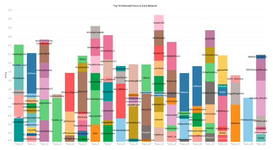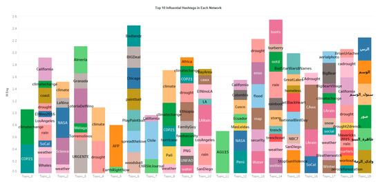 Figure 5 and Figure 6 display the top influential hashtags and users in each network where the length indicates the weighted Eigenvector centrality. Different from Figure 1 which includes the most significant keywords that distinguish each topic statistically, Figure 5 displays the most influential hashtags that best represent authors’ original intention on Twitter. Therefore, the hashtags are slightly different from the keywords. For example, the top 5 keywords in topic 19 are not the same language as the top 10 hashtags in topic 19. If we combine both figures together, more information about each topic can be obtained. For instance, the keywords that separate topic 0 from other topics are climatechange, cop and etc. The popular hashtags of topic 0 indicate that this topic focuses on climate change and COP 21, i.e., the 2015 United Nations Climate Change Conference. In addition, the keywords in topic 2 contain NASA, weather and impact. The hashtags in this topic focus on Science, NASA, La Niña and etc. Such hashtags and keywords also explain why the sentimental of topic 2 is the most objective and negative: this group of tweets is discussing the climate change due to the El Niño and La Niña with official agencies or scientific resources.