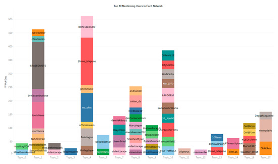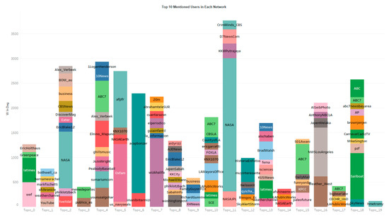 It is clear that the local news media in CA, ABC 10 News, is the most powerful Twitter user in many topics (Figure 6). This is probability because this Twitter account is also actively interacting with other Twitter users in topic 13 (Figure 8), especially with other local news as shown in topic 1, 13 and 14, where those local news media accounts have high Eigenvector centrality (Figure 6). NASA and some national news media, such as ABC News, are frequently mentioned in topic 2, 11, 18 (Figure 7). However, those mentioned Twitter accounts are not actively interacting with other users, as they are not listed as the top mentioning users or influential users (Figure 6, Figure 8). In addition to those national news media, some local news media, e.g., ABC7, and local public agencies, such as LAMayorsOffice, are also frequently mentioned in topic 4, 10, 13, 15 and 18.