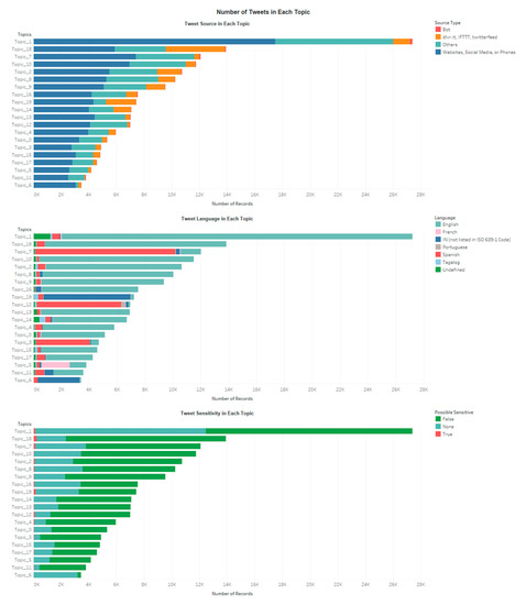 Figure 9 summarized the reputations of Twitter users in each topic and Figure 10 shows the sources, language and sensitivity of all tweets ordered by the number of tweets in each topic. Most tweets in topic 3, 5, 6, 7, 11, 12 and 19 are not in English. Topic 18 contains the most tweets that are published by bots or automatic tweeting services such as IFTTT, and include the most sensitive URLs. The other topics also contain a relative small portion of tweets from bots or automatic tweeting services. The reputations of Twitter users in topic 6 vary the most. This is because there is a large number of duplicated tweets in this topic where many tweets have 0 retweets, but a few tweets have huge retweets. The reputation of Twitter users in topic 19 is higher than other topics, and both topic 6 and 19 contain large number of tweets in the language of IN which is not listed on the ISO 639 language code (https://www.loc.gov/standards/iso639-2/php/code_list.php) or the Twitter official document (https://developer.twitter.com/en/docs/twitter-for-websites/twitter-for-websites-supported-languages/overview.html).