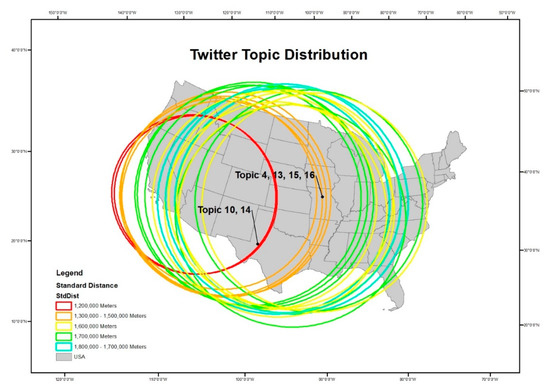 Although topic 1 has the most tweets located in the USA, topic 10 and 14 have the shortest standard distance that focuses on the west of the USA as shown on Figure 11 where the centroids of each circle indicate the mean centers of each topic and the radius of the circles represent the size of the standard distances.