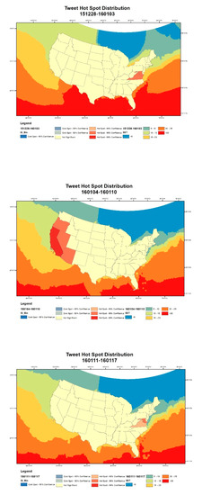 According to Figure 12, Twitter users in the District of Columbia and surrounding areas tended to be consistently more interested in El Niño on Twitter before or after the CA storm, namely from 1 December 2015 to 3 January 2016. However, there was a sudden and abnormal increase in the SST on the west coast of the United States between 28 December 2015 and 3 January 2016, accompanied by heavy rainstorms in areas in California between 4 January 2016 and 10 January 2016 [46]. The discussion of El Niño on Twitter in California and its surrounding states thus was seen to increase dramatically between 4 January 2016 and 10 January 2016. As the SST returned to normal after 4 October 2016, the hotspots of the Discussion on El Niño came back and stayed in the District of Columbia and its nearby areas. The hot–cold spots reveal a general pattern that before or after the CA storm, Twitter users in D.C. express significant interests on the discussion of El Niño. This might be due to the concentration of federal departments and news media agencies in D.C. area. However, during the week of the CA rainstorm, Twitter users in CA and surrounding states showed more interests on El Niño due to the direct impact.