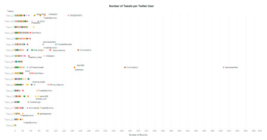 After combining all the outputs from Section 4, the different foci in tweets can be identified. Based on the common hashtags (Figure 5), the most mentioned and mentioning Twitter users (Figure 7, Figure 8), and the number of tweets in different language (Figure 2), topic 3, 5, 6, 7, 11, 12 and 19 contains significant portion of non-English tweets. This also explains why they have the least number of tweets that are geocoded in the USA. Topic 0 is a broad discussion of El Niño, for instance the World Economic Forum (@wef) is mentioned a lot. However, topic 9 and 17 also focus on the general or global discussion of El Niño. Those 3 topics are separated in the topic modeling because all of those contain a large number of tweets from one or two Twitter users, e.g., potential bots. Figure 13 calculate the number of tweets posted by each Twitter user in each topic. Topic 0 and 17 contain hug number of tweets from Twitter user tweetsbychkov while topic 9 contains many tweets from VinylrobotLA. Those extreme active Twitter users, or potential bots, lead to the Twitter discussion to 3 statistically different groups.