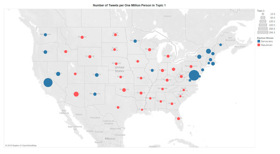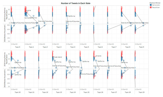 People’s perception is closely related to their nearby geographic and political environment [1,15]. The distribution of each topic is normalized by the population of each state to explore how the geopolitical environment impacts people’s discussion on El Niño on Twitter. Figure 15 depicts the distribution of the topic 1 within the United States spatially. The sizes of the dots indicate the number of tweets per one million persons in each state, and the colors represent the wining part in 2018 election. On average, people in District of Columbia and California produced the highest number of tweets, but people in District of Columbia talked more about El Niño in relation to climate change, while people in California focused on the real-time report of the storms. A clear pattern also emerged on Figure 14 indicating that people in states that voted for the Democratic Party in the 2016 Presidential Election talked more about El Niño than people in states that voted for the Republican Party. After comparing the correlation between the voting rate (data from [47]) for the two parties in each state, and the number of tweets in each topic per one million persons in each state, the researchers found that without considering DC and CA, topic 1 is the only one that significantly related to voting rate where states that favored the Republican Party had a moderate negative correlation with the number of discussions in the General Discussion on El Niño. Such a division is likely due to the factor that Democrat-led states focused more on cause, impact, and action of climate change [37], and discussions and responses to climate change news are dominated by climate change activists rather than climate change deniers [23]. However, none of those tweet densities are statistically related to the 2016 median household income in each state.