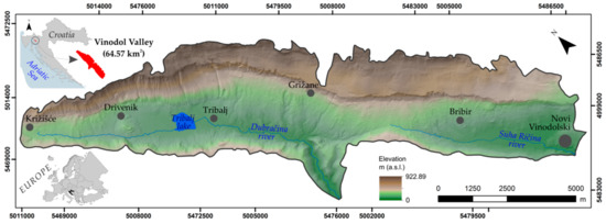The procedure taken to identify and map the soil erosion processes has been developed for the Vinodol Valley (64.57 km2), which is situated in the northwestern coastal part of the Republic of Croatia (Figure 1). The area is predominantly rural, and it has been inhabited since the prehistoric times [59]. More than 50 small settlements situated in the valley are connected by a relatively dense road network consisting of two county roads, several local roads, and numerous unnamed roads and pathways. Prevailing elevations are in the range between 100 and 200 m a.s.l., with an average elevation of 283 m a.s.l. [55]. Slope angles between 5° and 20° prevail, and the average angle is 16°. The valley has an irregular, elongated shape. The steep valley flanks are built of Upper Cretaceous and Paleogene carbonate rocks, while the lower parts and the bottom of the valley are built of Paleogene flysch rock mass [54]. Flysch bedrock is almost entirely covered by Quaternary eluvial, colluvial, and proluvial soils [55], which are formed by geomorphological processes active both in the carbonate and flysch rock mass [58,60]. The climate is maritime [61], with mean annual precipitation between 300 and 700 mm. The rainy period lasts from November to May, with precipitation at its maximum in November when rainstorms of high erosive potential frequently occur. Forests cover an area of 32.19 km2 [62]. Other important land covers are shrubs (6.17 km2) and natural pastures (5.66 km2). The topography of the Vinodol Valley has been generally divided into three parts, i.e., the northwestern, the central and the southeastern parts [60]. The northwestern and the central parts belong to the Dubračina River Basin, while the southeastern part belongs to the Suha Ričina River Basin.