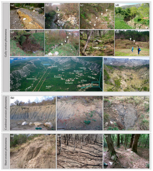 Photographs of erosion phenomena identified in the Vinodol Valley. The gully erosion phenomena formed along: (a) the local road, (b,c) pathways, (d,e) agricultural terraces, and (f) their boundaries; (g) an example of the stone check dam built to control the gully erosion; (h) a gully formed under the forest; (i) a view from the air of the central part of the Vinodol Valley, with depicted detail of the Slani Potok gully, shown in (j). (k–m) The combined erosion phenomena characterized by the small drainage network associated with colluvial deposits; (n) the sheet erosion phenomena formed in eluvial deposits, and in (o) the forest, as indicated by the exposed tree roots (p).