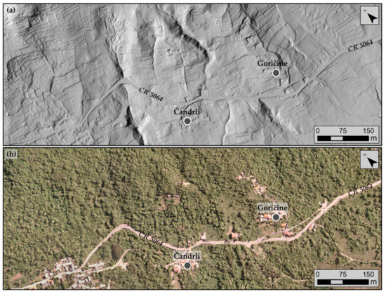 Additional topographic information that was used in this study was available from two official state maps: the Croatian base map (CBM) 1:5000, and the digital orthophoto map (DOM) 1:5000, which was created in 2006. Lithologic data were available from the engineering geological map (EGM) of the Vinodol Valley on the scale of 1:5000 [55], which was created based on the detailed visual interpretation of HR LiDAR imagery from March 2012.