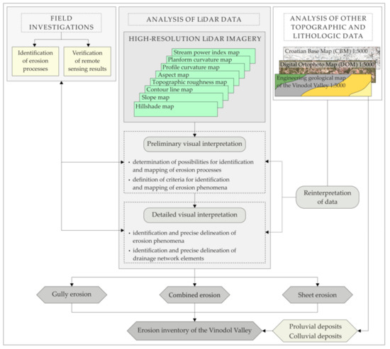A general overview of methodology for the preparation of erosion inventory for the case study of Vinodol Valley is presented by a flowchart in Figure 4. The methodology was primarily based on the analysis of HR LiDAR imagery, which was performed in two steps: the preliminary and the detailed visual interpretation. The procedures of the visual interpretation of LiDAR imagery were complemented by the field investigations data, as well as the analysis of additional topographic (CBM 1:5000; DOM 1:5000) and lithologic (EGM 1:5000) data.