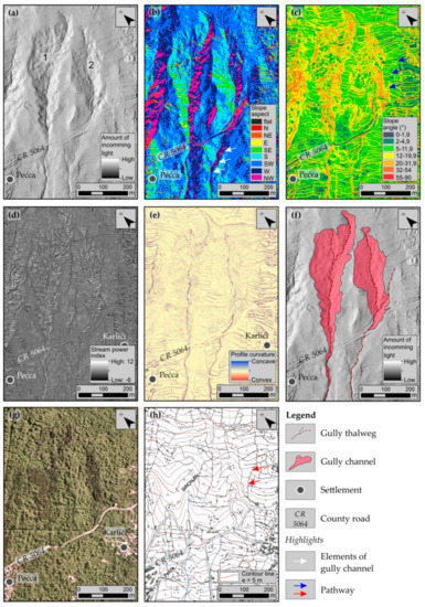 Figure 9 presents an example of identification and mapping of the area affected by the combined erosion processes, situated in the central part of the Vinodol Valley. A generally disturbed surface appearance was first recognized on the hillshade map (Figure 9a). A small drainage network was recognized on the stream power index map (Figure 9b) and the planform curvature map (Figure 9c). These recognition features were mainly recognized within the relief concavities surrounding the gully channels. The rough texture of the affected areas (Figure 9d) distinguishes them from the surroundings. However, the recognition features shown in Figure 9a–d were not specific to the surface of all relief concavities in the study area, even though the gullies were formed at their central part and the proluvial and colluvial deposits were accumulated in the toeslope [55]. Thus, the topographic location was considered to be the most relevant recognition feature for identification and mapping of combined erosion phenomena, coupled with the typical pattern representing gullies identified in the central part of relief concavities. A precise delineation of areas considered to be affected by the combined erosion processes was carried out based on the visual analysis of the aspect map (Figure 9e) and the slope map, coupled with the contour line map (Figure 9f), similar to the example shown in Figure 9g.