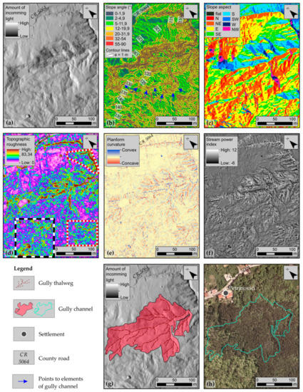 By contrast, the planform curvature map (Figure 6e), and the stream power index map (Figure 6f) clearly reflect the topography inside the gully channel. These maps, mostly in combination, thus provided a precise delineation of gully thalwegs. The stream power index map has also aided the identification and mapping of certain portions of the gully channel, given the well-expressed slope ridges. The delineated polygon representing the gully channel and lines representing the gully thalwegs are presented on the hillshade map in Figure 6g. In this case, delineation of the gully thalwegs was performed first and it significantly helped in the visualization of the shape and extent of the gully channel. The gully was also previously known, due to its formation near the county road. However, its topography is not visible on DOM 1:5000 (Figure 6h), but indices of erosion processes are marked as alterations in the vegetation type.