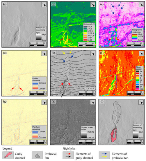 Visualization of topography of a small gully on HR LiDAR imagery: (a) the semi-transparent (50%) hillshade map 45°/45° over the hillshade map 315°/45°; (b) the slope map; (c) the topographic roughness map; (d) the profile curvature map; (e) the contour line map over the hillshade map; (f) the aspect map; (g) the planform curvature map; and (h) the stream power index map. (i) The hillshade map with delineated polygons representing the gully channel and the proluvial fan.