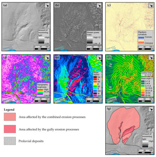 Visualization of topography of area affected by the combined erosion processes on HR LiDAR imagery: (a) the semi-transparent (50%) hillshade map 45°/45° over the hillshade map 315°/45°; (b) the stream power index map; (c) the planform curvature map; (d) the topographic roughness map; (e) the aspect map; (f) the contour line map over the slope map. (g) The hillshade map with delineated polygons representing the area affected by the combined erosion processes, the area affected by the gully erosion processes, and the proluvial deposits.