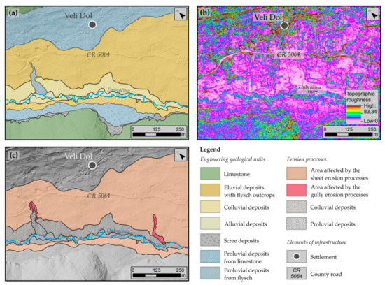 The sheet erosion processes in the study area were first identified in the field. It was found that the sheet erosion predominantly acts on slopes mostly built of eluvial deposits with sporadic flysch outcrops. Since these processes do not form specific morphological features on the affected surface, the direct recognition of sheet erosion on LiDAR maps was not possible. Hence, the first step in mapping of the sheet erosion phenomena was the interpretation of the engineering geological map of the Vinodol Valley [55] to locate areas of eluvial and colluvial deposits (Figure 10a). The assumption that colluvial deposits were formed by the reoccurring sheet erosion processes on the surface of eluvial deposits was proven by determination that the colluvial deposits are located at the foot of the eluvial slopes in almost the entire studied area. The relatively smooth surface topography of eluvial slopes, which can also be considered as indicative for the sheet erosion, was additionally recognized on the topographic roughness map (Figure 10b). In accordance with all presumptions, the mapping of the sheet erosion phenomena was performed indirectly, based on the reinterpretation and transformation of the boundaries of eluvial deposits (Figure 10a) into the polygons representing the areas affected by the sheet erosion processes (Figure 10c).