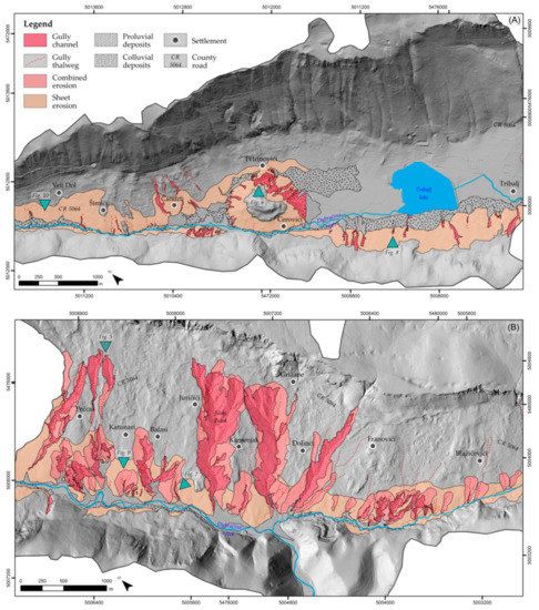 Details from the erosion inventory map of the Vinodol Valley for (A) the northwestern part and (B) the central part of the valley. Green marks highlight examples of erosion phenomena presented in previous figures.