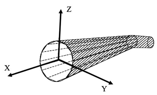 Each pipe segment consists of two sections, and if the position of the vertices on the two sections on the pipe section can be determined, an entire pipeline can be determined. We take the center of each section as the origin, the X-axis along the pipeline, and the Cartesian coordinate system on the Y-axis in the section (as shown in Figure 1). Since the cross-sectional shape of the pipeline is known, the position of the point on the pipe cross section in the local coordinate system can be determined. The position P s of the center of the section in the world coordinate system is stored in the geometric information of the online object so that the translation matrix ( M t ) of the center of the section can be obtained.