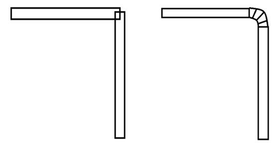 When the pipeline is an inflection point, it is necessary to process the cross-section rotation matrix of the connected pipe segments before and after the inflection point so that the front and rear sections can be connected. The inflection point smoothing effect can be achieved by inserting several sections with smooth transitions, while the original two sections need to be retracted a distance to meet the smooth section, as shown in Figure 2.