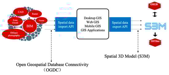 To facilitate sharing of multi-source heterogeneous geospatial data, the open geospatial database connectivity (OGDC) was proposed to connect different types of geospatial data (Figure 7). OGDC provides a unified entry to geospatial data [43]. The unified data specifications, such as I3S [18] and S3M, can be used for high-performance, consistent access to data in the system, such as various GIS terminal applications, and user APPs.