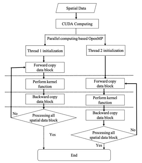 The computing-intensive framework plays an essential part in high-performance based smart city applications [30]. Parallel computing is an effective way to visualize 3D city models [31,32]. 3D city modeling requires effective algorithms [33,34]. NVIDIA, inventor of the graphics processing unit (GPU), proposes a parallel computing framework based on computing unified device architecture (CUDA), which can be used to speed up the processing efficiency of geospatial applications [35,36,37]. The multi-threaded parallel processing based on multi-core central processing unit(CPU)s provides extensive computational capabilities [38,39]. The scientific computing for building city modeling is shifting from a CPU-centric central processing model to a collaborative processing model in which CPUs and GPUs work together [40].