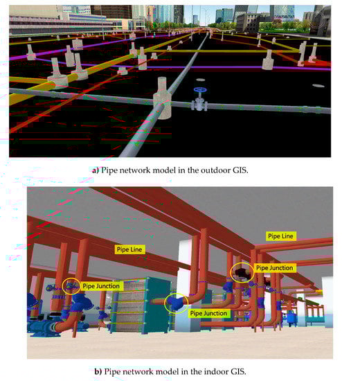 Utility networks are modeled using graph-theory abstractions [10,11], because the structure properties of graph provide network nodes and links. Most utility networks are based on two dimensional modeling design [12], but in some cases, applications such utility networks operate in 3D [13,14,15]. Pipe network is one type of utility network, the construction of a 3D pipe network is based on network science and GIS. As the BIM-oriented network model can be used in indoor network applications [16], a 3D pipe network should be used in both outdoor and indoor GIS. It is challenging to design 3D pipe networks by considering visualization, checking topology, data management, and 3D network analysis.
