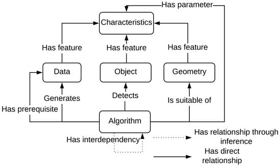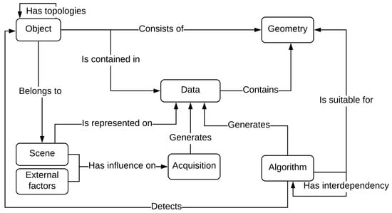 Reference [] presents the requirement of the knowledge modeling for the design of the object detection process. It is necessary to detect the geometric characteristics of the objects (e.g., shape, surface) and their topologic relationships (e.g., distance between objects, connection, perpendicular) in order to identify the objects that constitute the data. The detection of these characteristics requires the use of algorithms. Algorithms are designed to identify geometries (e.g., plane, line, sphere, segments, orientation). They provide new data (e.g., sampled data, filtered data) or new data characteristics (e.g., segments, density).
