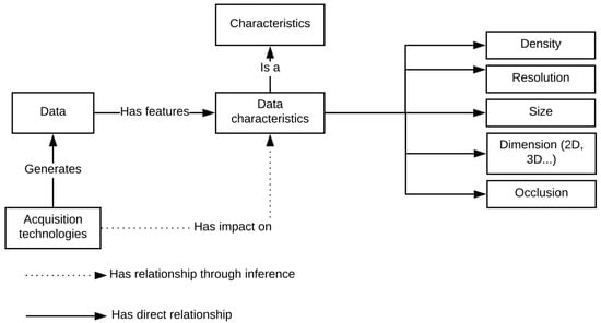As shown in Figure 2, data is a representation of a scene, obtained through acquisition. This acquisition process, more precisely the instruments and the methods used for the acquisition, influences the data characteristics. In addition, elements influencing the acquisition process itself, such as external factors and the acquired scene, transitively impact the data characteristics. The data characteristics such as density, noise, resolution, dimension, size and occlusion comprise the specificity of each data. Figure 3 shows the generic semantic description and the relation between any data and its acquisition process.