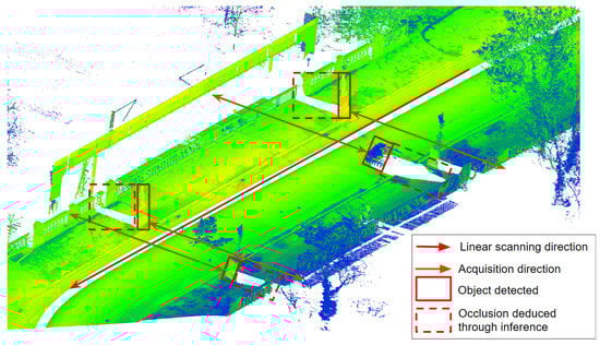 This example shows an acquisition process by horizontal scanning (see brown arrows in Figure 4) along a linear path (illustrated by the red arrow in Figure 4). Such acquisition process using a Lidar laser scanner as an acquisition instrument systematically produces a local loss of information caused by objects that occlude parts of the scene. The loss of information often translates into an over-segmentation (the same object segmented into several parts) and detection failure during the process of data understanding.