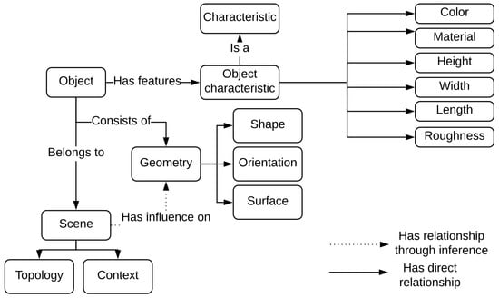 Three main parts compose the semantic description of objects: object characteristics, its geometry and the scene that it belongs to. They aim at facilitating the adaptation of detection strategies. Figure 5 illustrates the generic semantic description of an object.